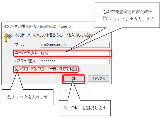 6. ユーザー名をお客様登録通知書記載の「アカウント」を入力し、「パスワードをパスワード一覧に保存する」にチェックを入れ、「OK」を選択します。