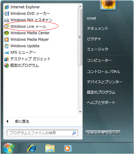 1. スタートボタンから「全てのプログラム」を選択し「WindowsLiveメール」を実行します。