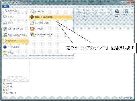 2. WindowsLiveメール2011を開いて「メニューボタン」クリックし、「オプション」→「電子メールアカウント」を選択します。