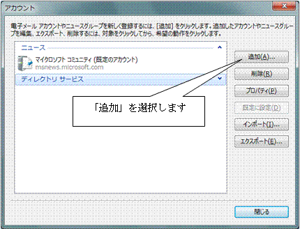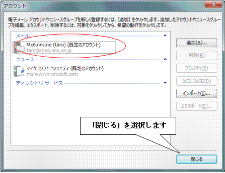 8 . メール設定が追加されている事を確認し、「閉じる」を選択します。