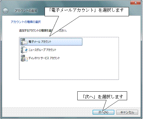 4. 「電子メールアカウント」を選び、「次へ」を選択します。