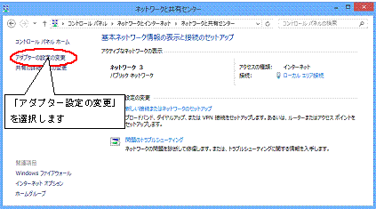 4.ネットワークと共有センターから「アダプターの設定の変更」を選びます。