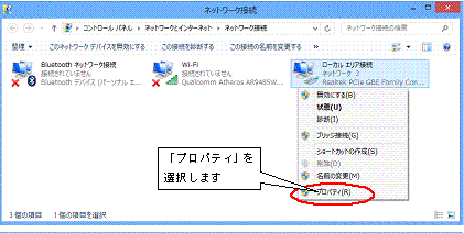 5.ネットワーク接続から該当する「ローカルエリア接続」※1を選択し、マウスの右ボタンをクリックして「プロパティ」を選択します。