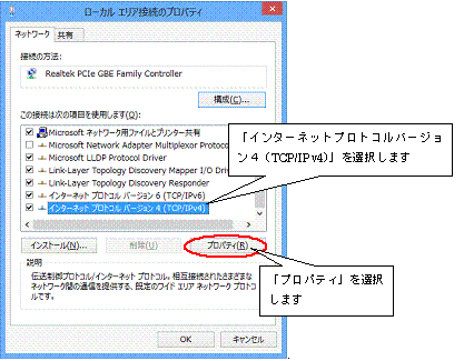6.「ローカルエリア接続のプロパティ」が表示されたら「インターネットプロトコルバージョン4(TCP/IPv4)」を選択し「プロパティ」ボタンをクリックします。