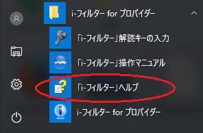 1. 「スタート」ボタンから「すべてのプログラム(P)」もしくはプログラム一覧から「i−フィルター for プロバイダー」−「i−フィルター for プロバイダー ヘルプ」をクリックしてください。