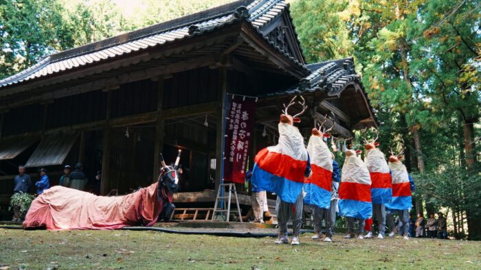 高知県四万十町・地吉地区の「五ツ鹿踊り」。太鼓の音に合わせ、鹿の面をつけた男たちが舞います。古くより受け継がれてきた、山里の人々の祈りと誇りの舞。山あいに響く太鼓の音が、今も祭りの心を伝えます。(制作:四万十ケーブルテレビ)