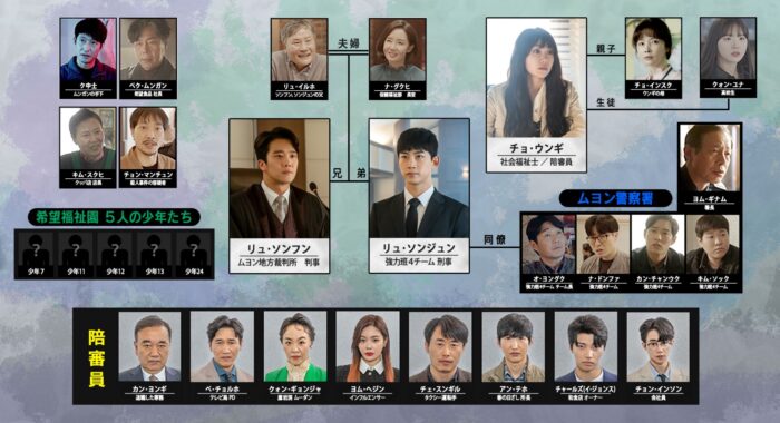 2PMに所属しアイドルとして活動する一方で、「ヴィンチェンツォ」では怪演を見せるなどマルチな俳優としても知られるオク・テギョンと、「自己発光オフィス~拝啓 運命の女神さま!~」などで主演を務め、甘いマスクが魅力の俳優ハ・ソクジンが連続殺人事件の真実を暴くために奮闘する兄弟の刑事と判事をそれぞれ熱演!演技派俳優2人によって演じられる兄弟間のケミストリーからも目が離せない!また、「酒飲みな都会の女たち」で高い演技力を披露し注目を集めるチョン・ウンジ(Apink)が事件の真相を暴く重要人物として、さらにストーリーを盛り上げる!