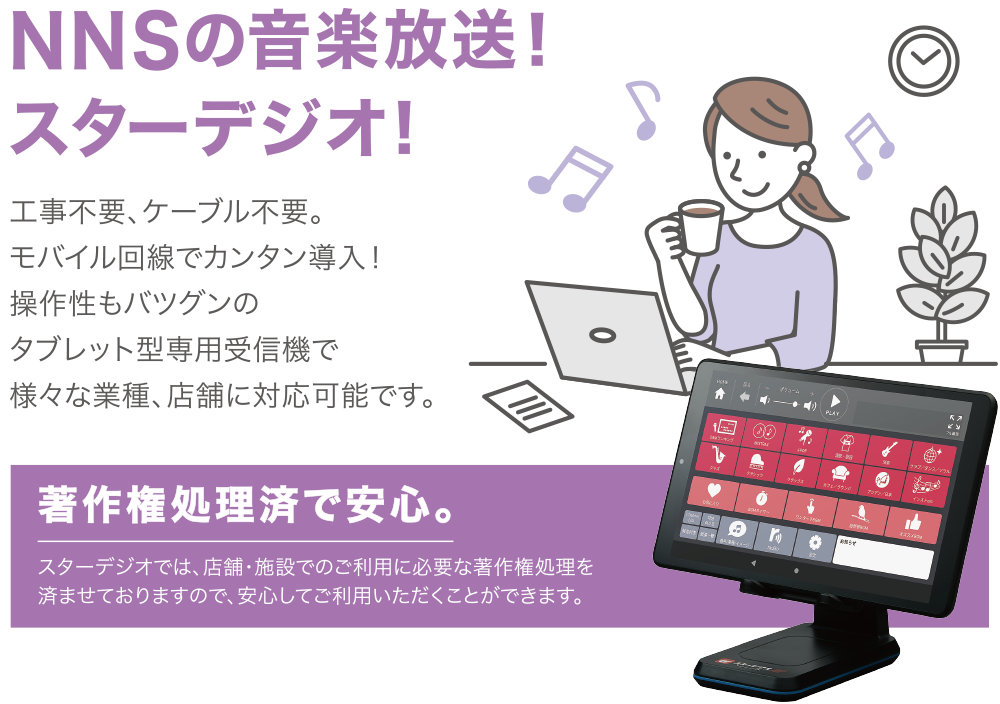 - 作業員がお伺いし、端末を設置いたします。設置日より音楽放送をお楽しみください。