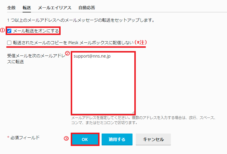 ①「メール転送をオンにする」にチェックを入れます。