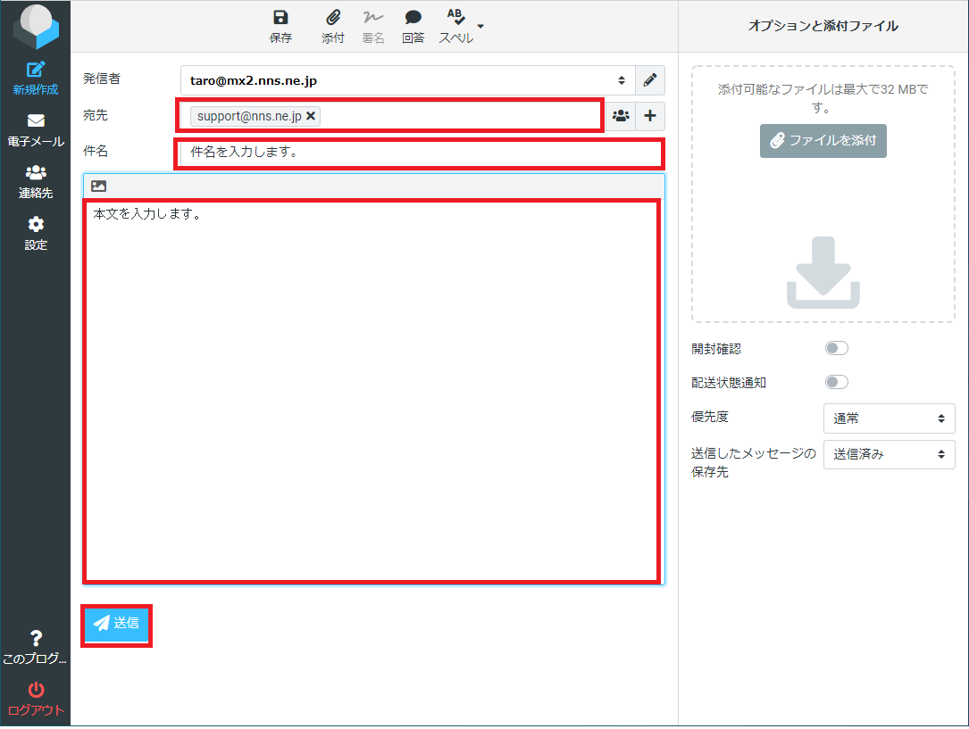 件名、本文を入力後、画面左下の「送信」をクリックします。