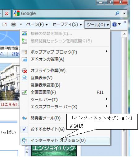 1.インターネットエクスプローラーを起動して、「ツール」->「インターネットオプション」を選択します。