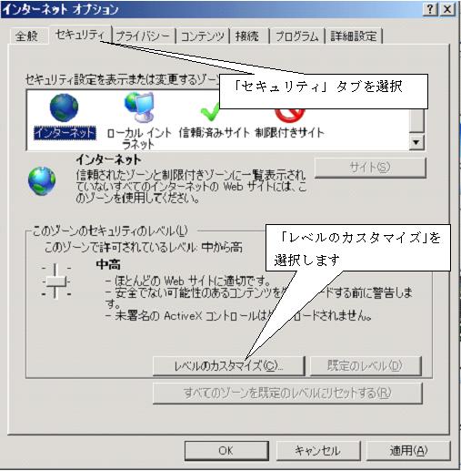 2.「セキュリティ」タブを選択し「レベルのカスタマイズ」ボタンを選択します。