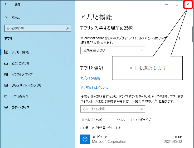 その後、画面の右上の×ボタンを選択し、ブラウザを終了します。