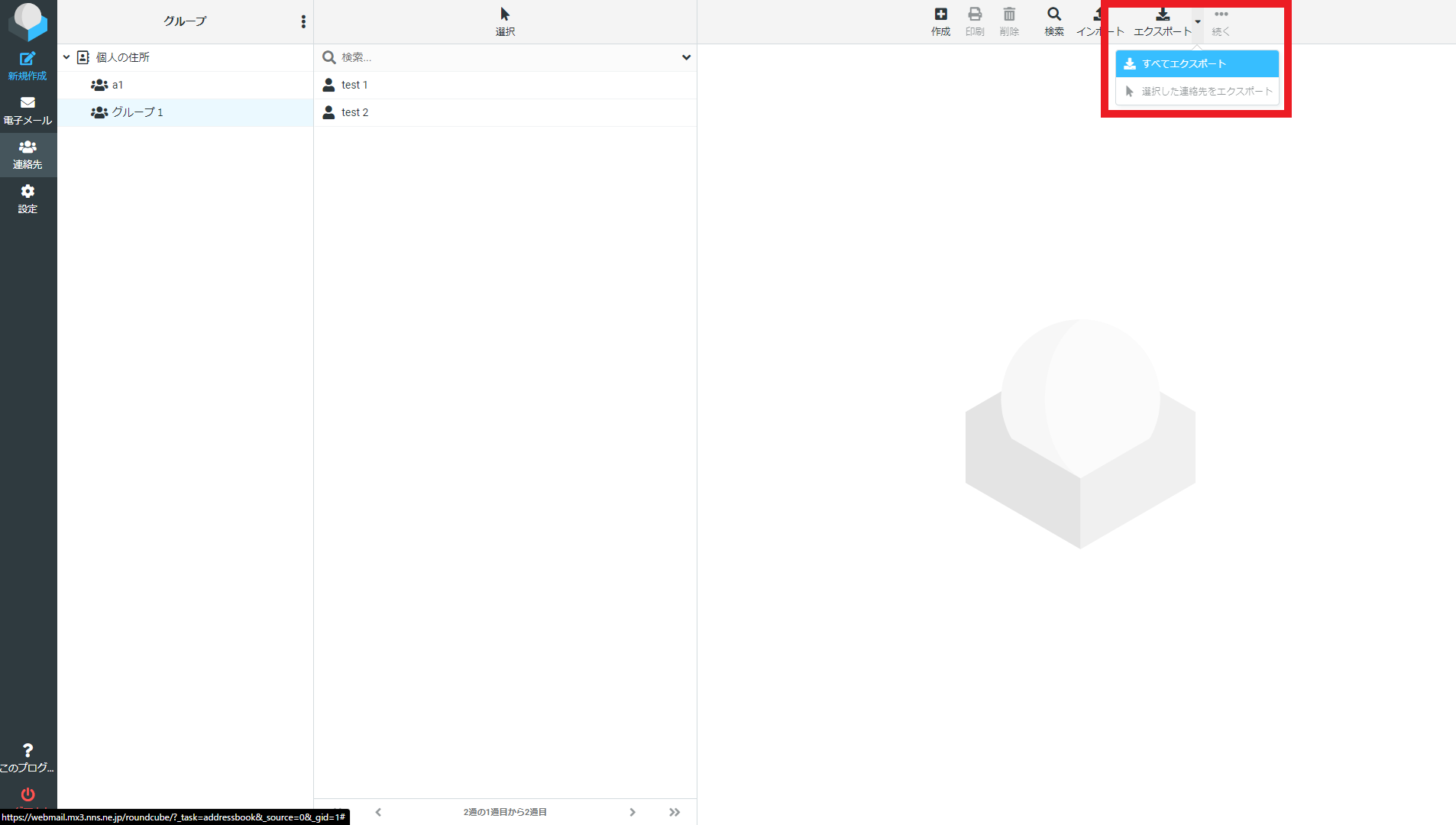 右上のエクスポートをクリックした後、「すべてエクスポート」を選択することで連絡先情報がダウンロードされます。