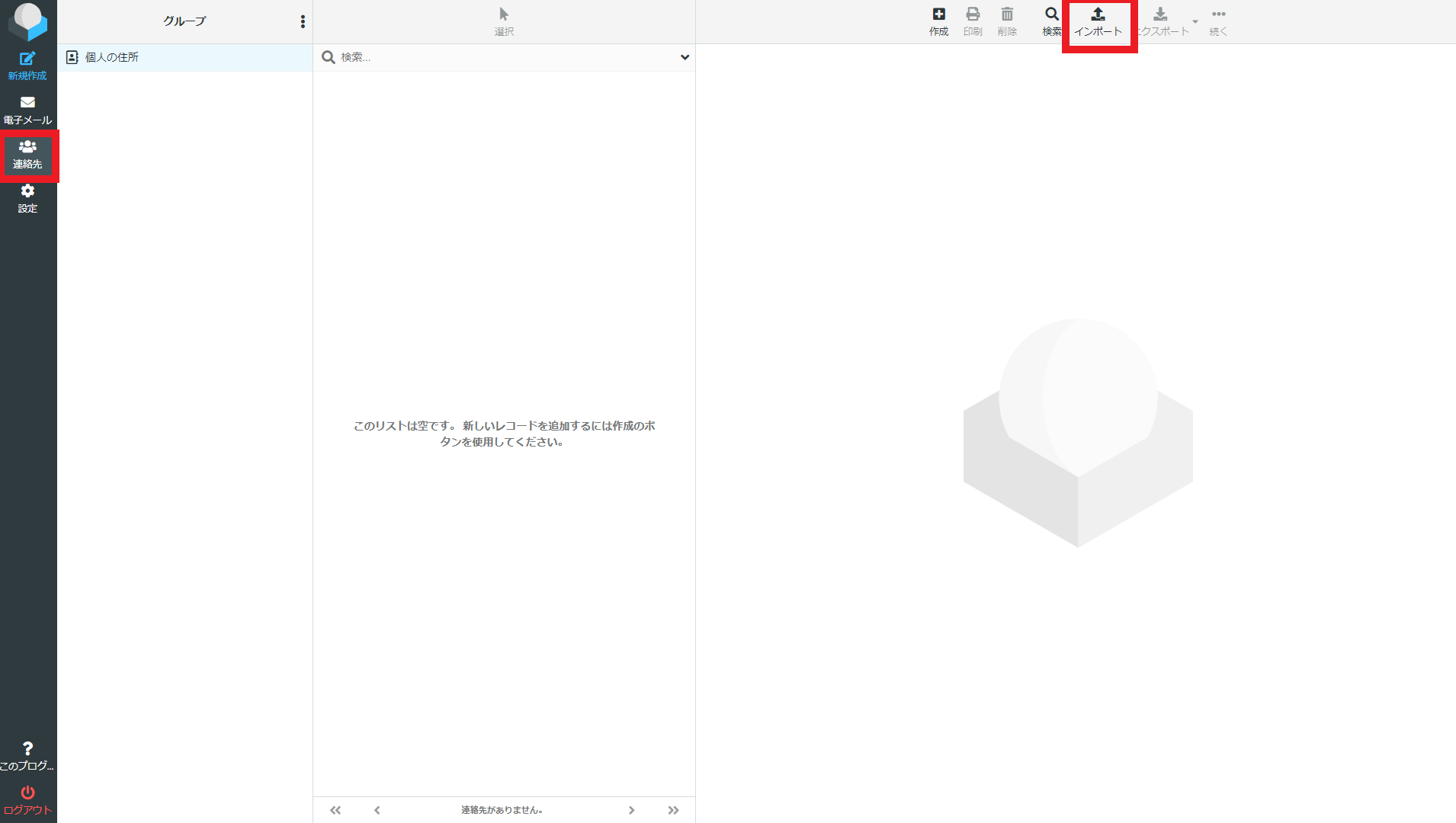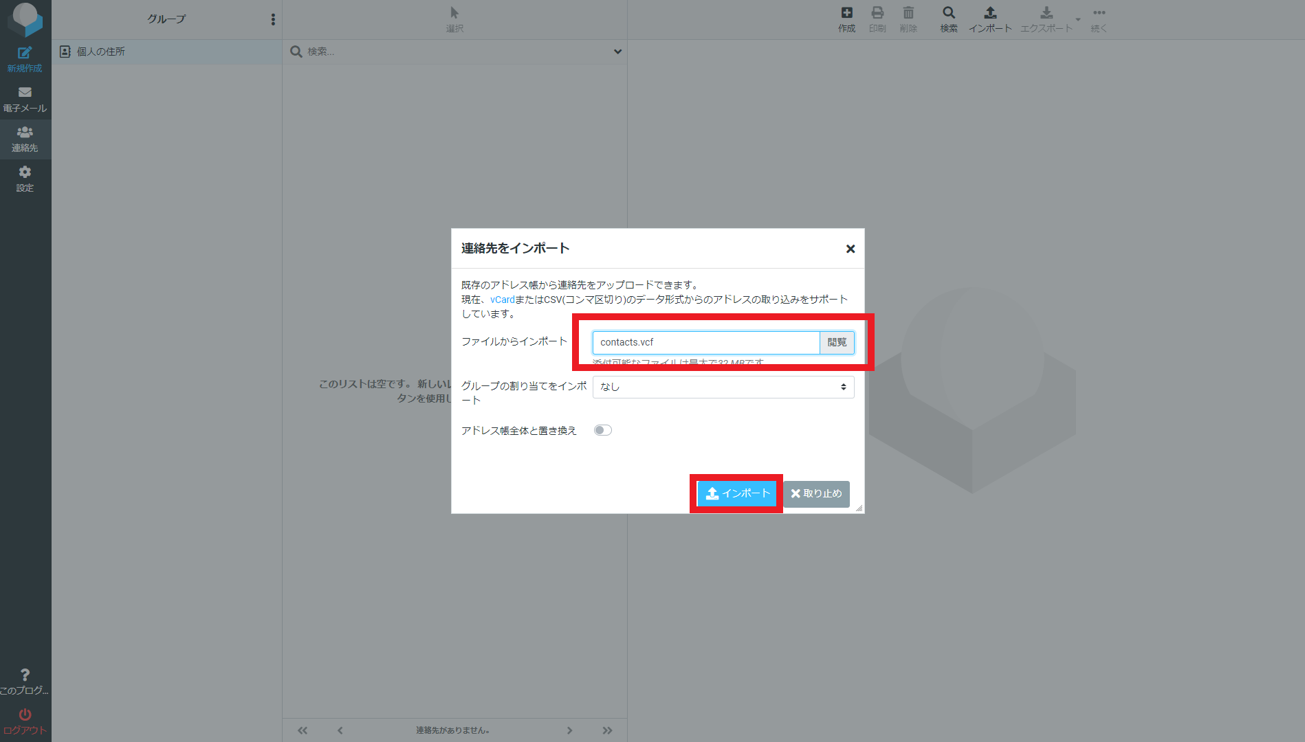 左側メニューの連絡先を選択し、連絡先画面を表示したのち、画面右上のインポートをクリックします。