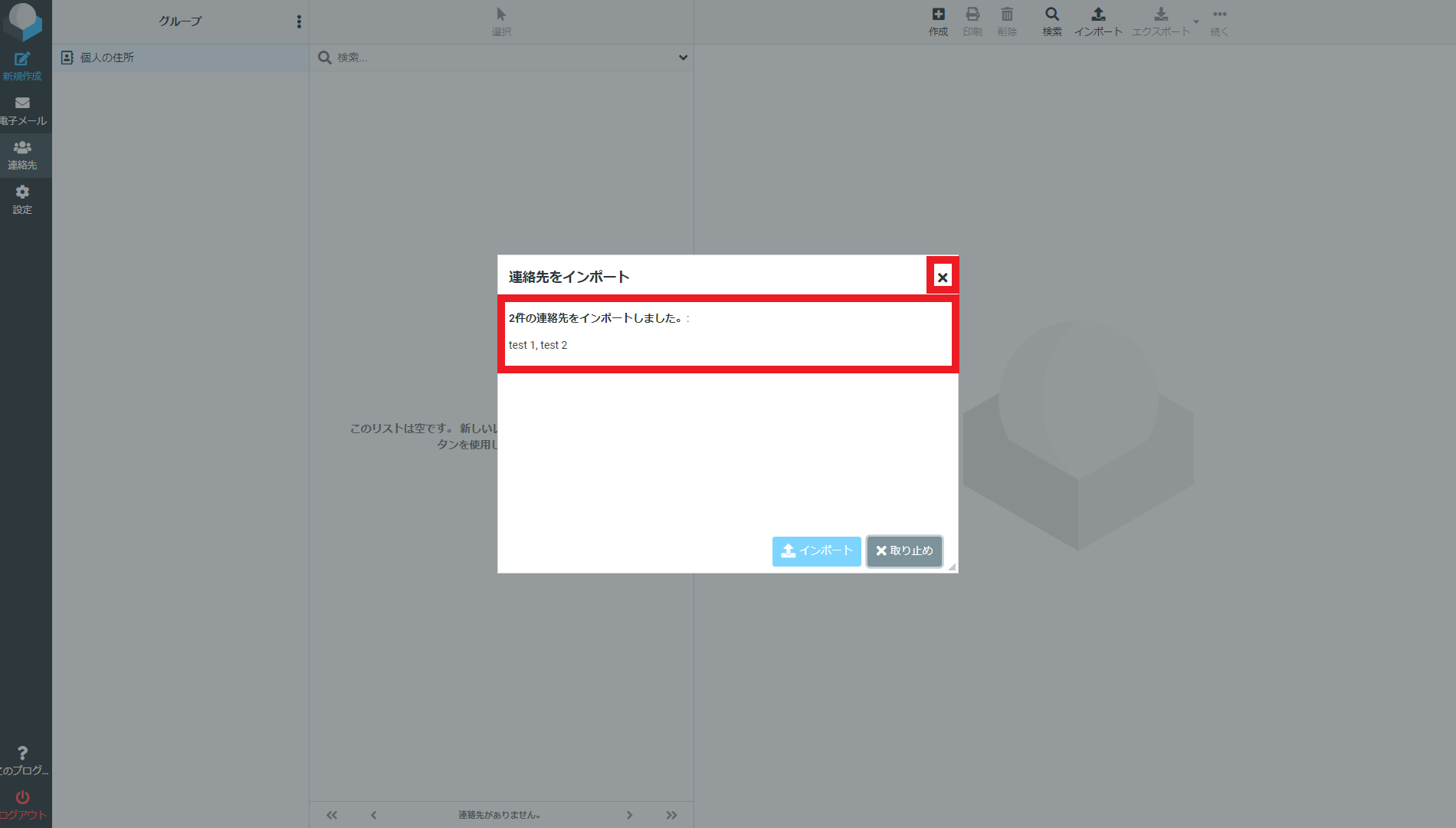 インポートされた連絡先が表示されたことを確認し右上の「×」で画面を閉じてください。